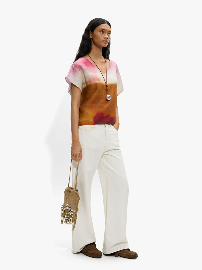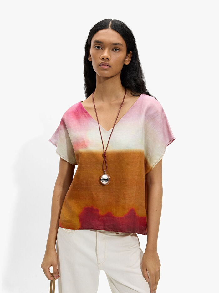 Suluboya efektli desenli bluz. %100 ketenden üretilmiştir. Sivri yaka. Düşük omuz. Arka kısmı hafif daha uzun etek ucu. Model 1.77 m boyunda ve S beden giymektedir.