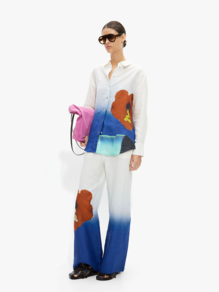Çiçek desenli gömlek. %100 keten kumaştan üretilmiştir. Yaka yakalı. Uzun kollu; düğmeli manşetler. Düğmeli ön. Yuvarlak etek ucu. Model 1,79 m boyunda ve S beden giymektedir.