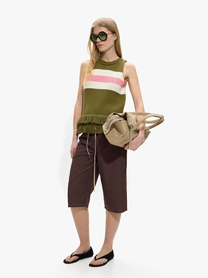 Çizgili örme üst. %100 pamuktan üretilmiştir. Yuvarlak yaka. Kolsuz. Saçaklı etek ucu. Model 1,78 m boyunda ve XS-S beden giyiyor.