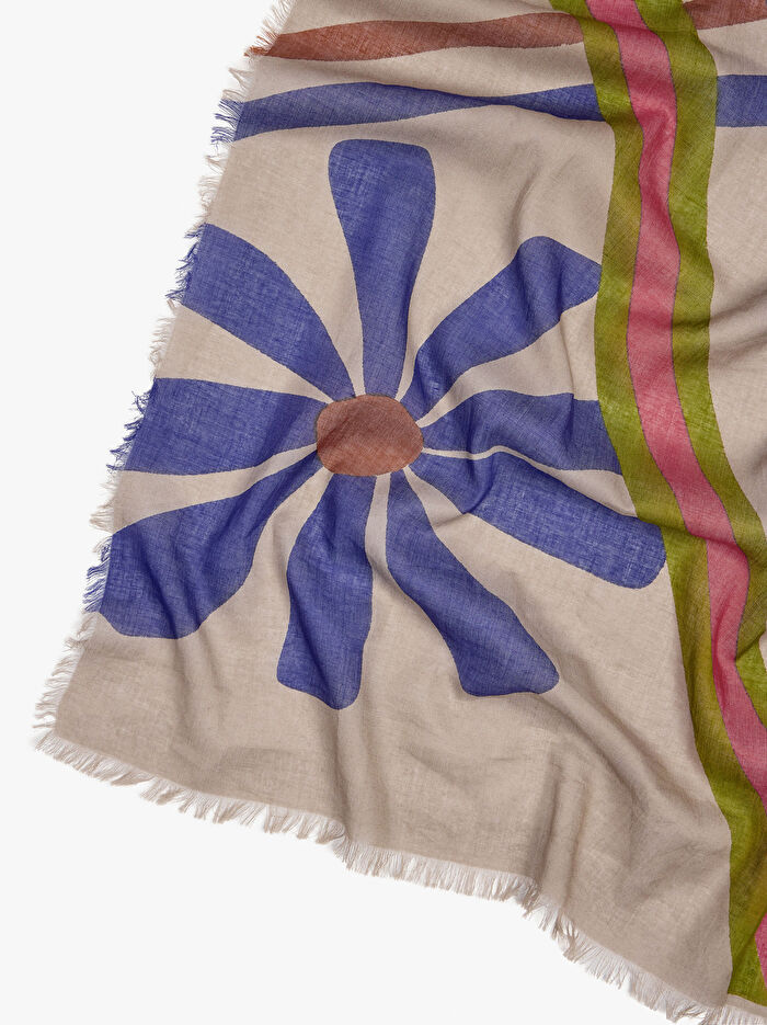 Tropikal desenli hafif şal. %100 pamuktan üretilmiştir. Kenarlarında saçaklar. Her kıyafete canlı ve zarif bir dokunuş katmak için idealdir.