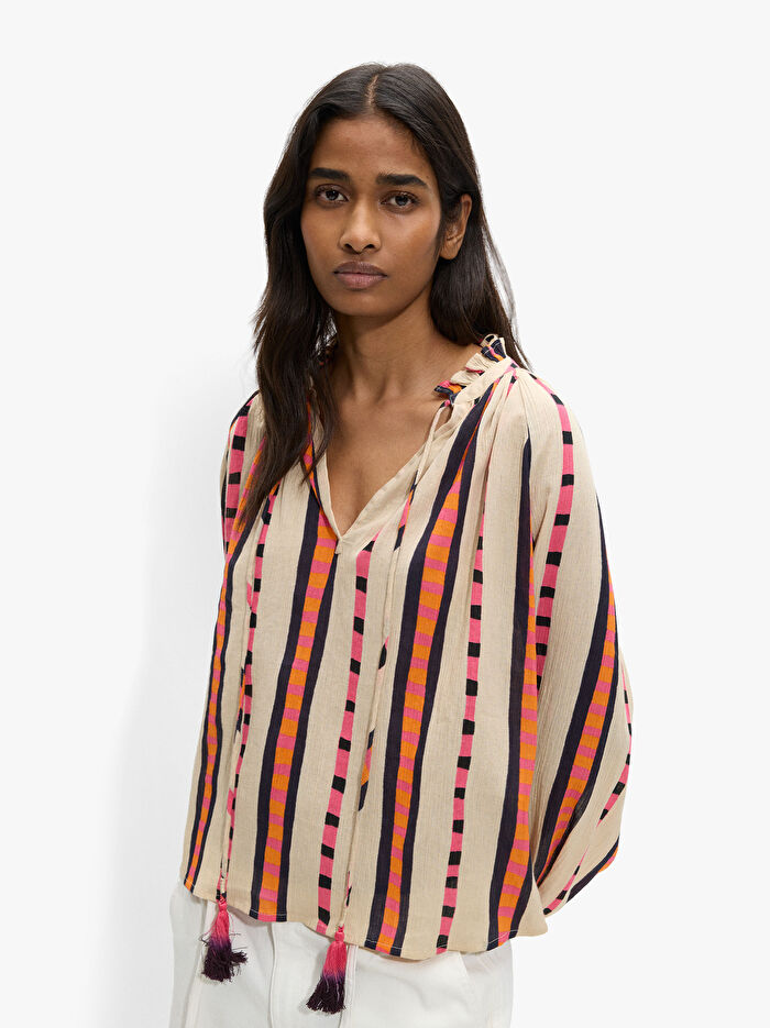 Kontrast renkli çizgili ve kareli desenli, dökümlü bluz. %100 pamuktan üretilmiştir. Fırfır detaylı sivri yaka; uçlarında püsküllü bağcık. Elastik manşetli uzun balon kollu. Model 1,78 m boyunda ve S beden giymektedir.