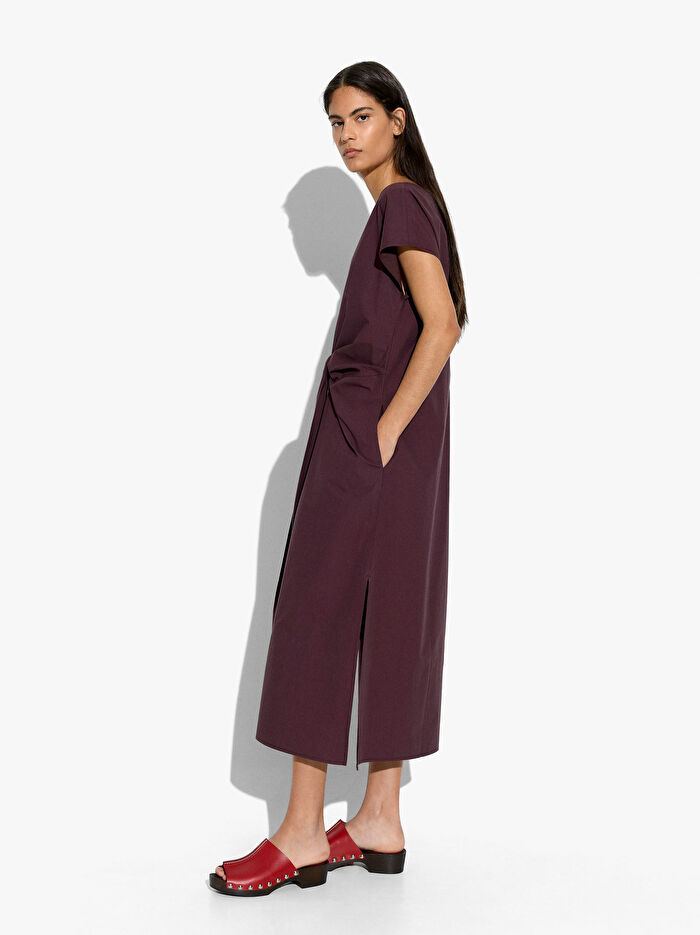 %100 pamuktan üretilmiş midi boy düz elbise. İç astarlı. Önde bağcıklı askı detayı. Alt kısımda yan yırtmaçlar. V yakalı. Düşük kesimli kısa kollu. Model 1,76 m boyunda ve M beden giyiyor.