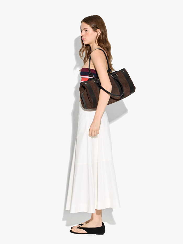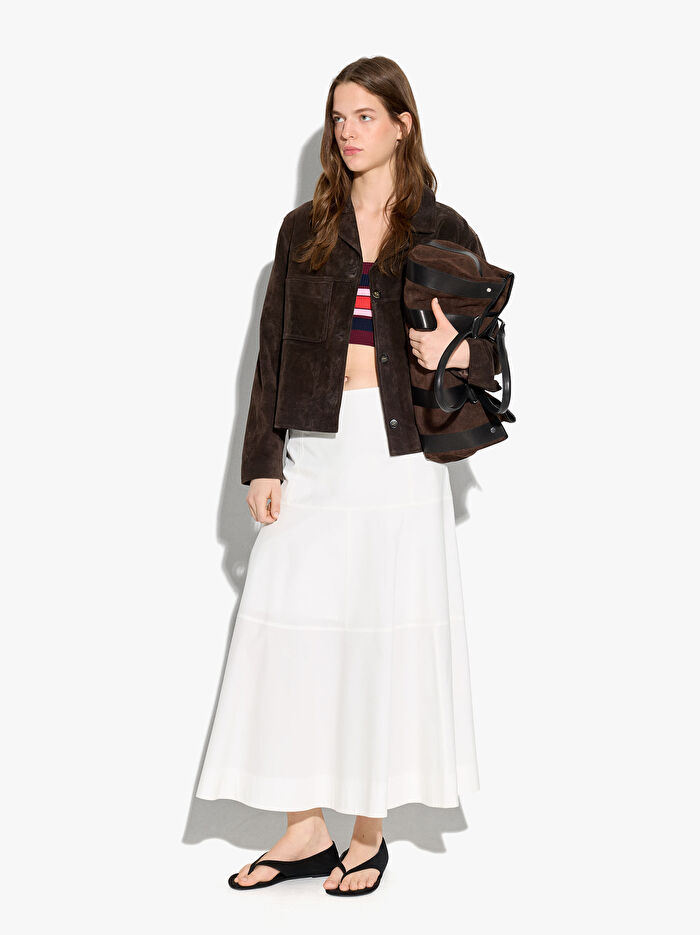 Panelli midi etek. %100 pamuktan üretilmiştir. Ön ve arka kısımda pileler. Tek tarafta gizli fermuarlı kapatma. Model 1.75 m boyunda ve S beden giymektedir.