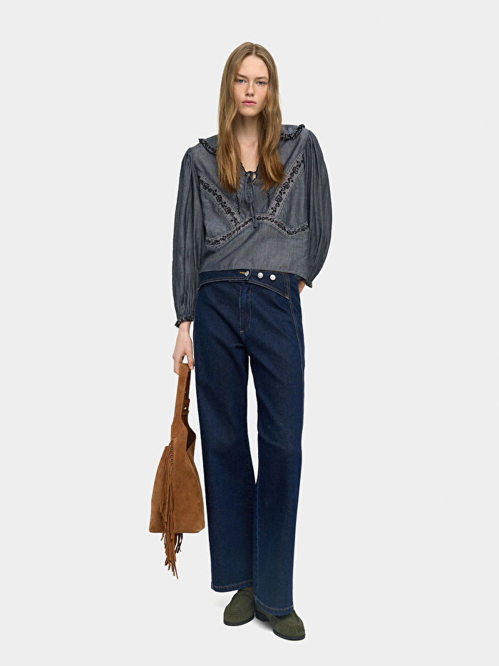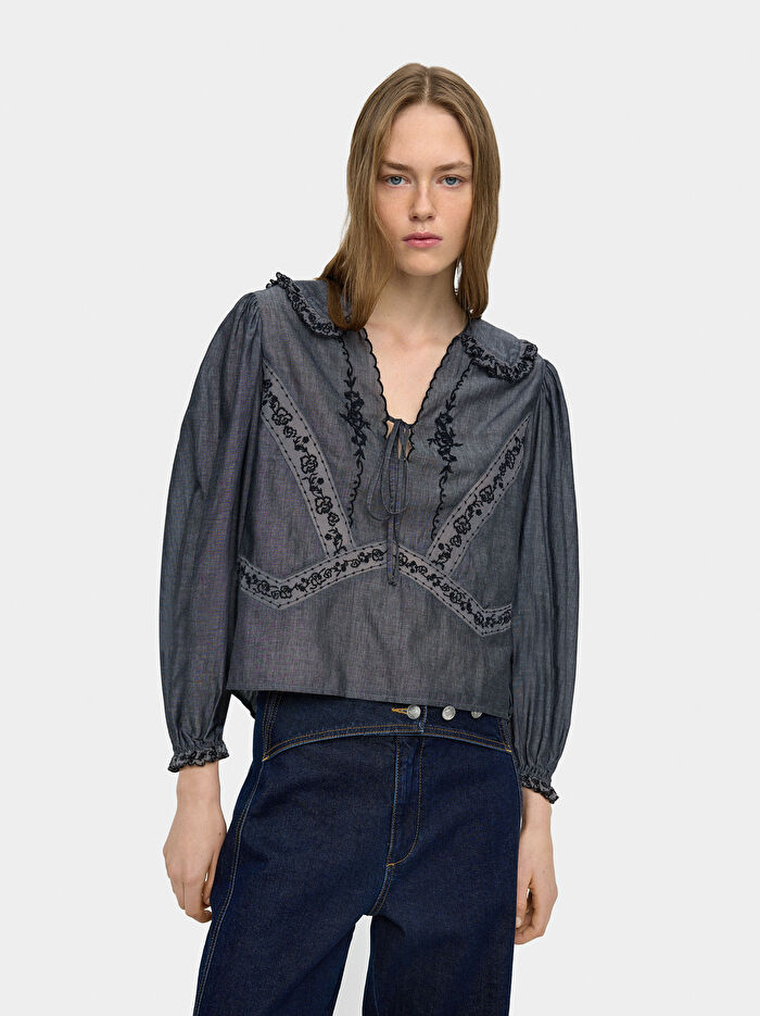 Ön ve arka kısımda işlemeli detaylara sahip bluz. %100 pamuktan üretilmiştir. Manşetlerinde fırfırlı uzun kabarık kollu. Bağcıklı V yakalı ve fırfırlı yaka. Model 1,81 m boyunda ve S beden giymektedir.