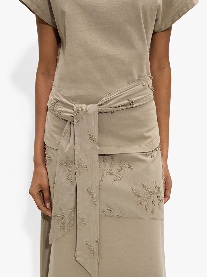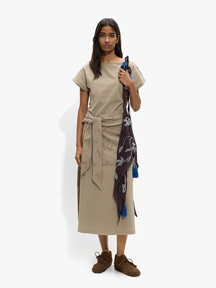 %100 pamuktan üretilmiş sade bluz. Tekne yaka. Düşük omuz. Arkada nakış detayı. Önde uzun etek ucu, bağlamalı askı. Model 1.78 m boyunda ve XS-S beden giymektedir.