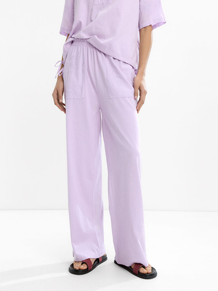 %100 pamuk pantolon. Büzgülü elastik bel. Nakışlı yan cepler. Model 1,75 m boyunda olup S beden giymektedir.