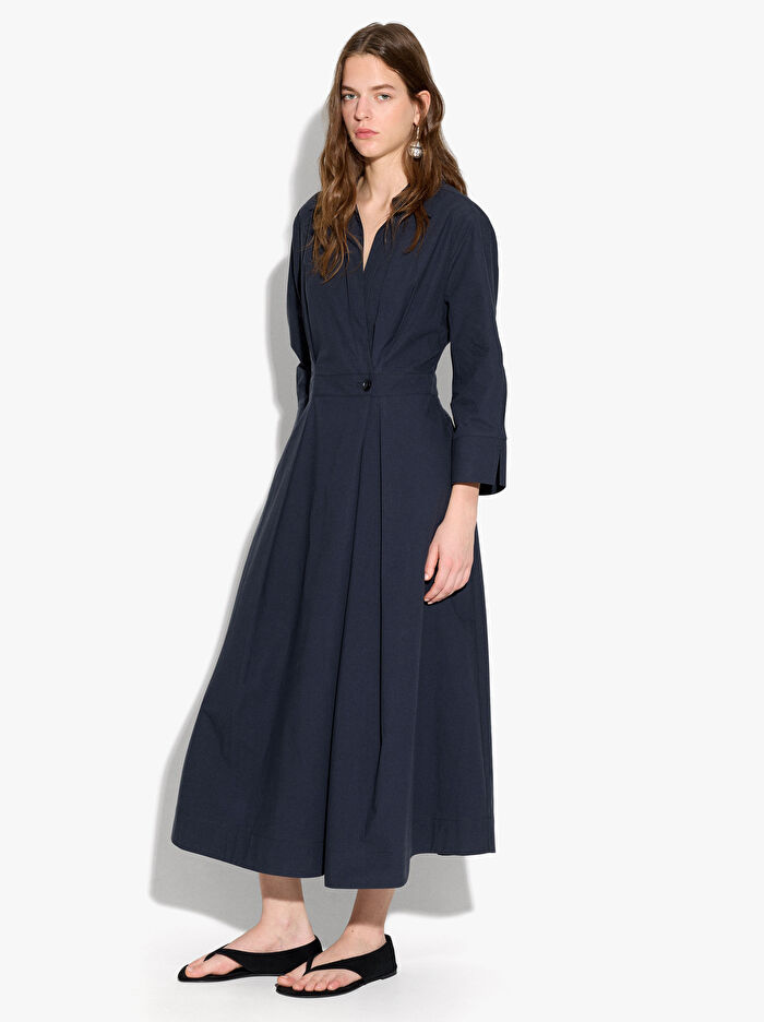 %100 pamuk uzun elbise. Gömlek tarzı üst kısım: yakalı, manşetli 3/4 kollu. V yakalı. Bel kısmı belirgin. Üst üste binen ve hafifçe genişleyen etek. Düğmeli. Model 1,75 m boyunda ve M beden giyiyor.