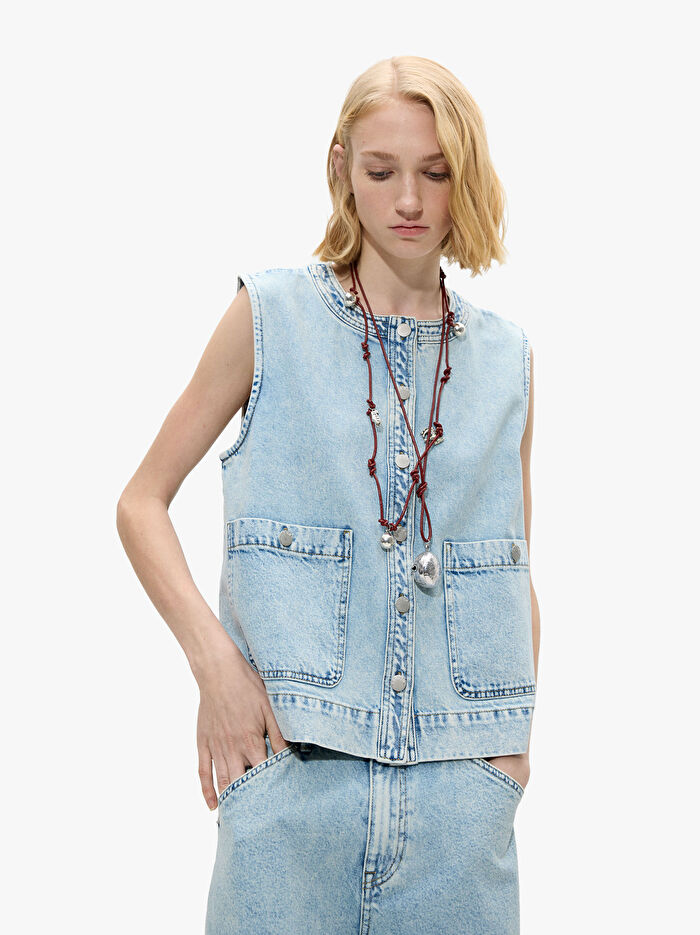 %100 pamuktan üretilmiş denim yelek. Yuvarlak yaka. Kolsuz. Yan yama cepler. Kopçalı düğme ile kapatma. Model 1.78 m boyunda ve M-L beden giymektedir.