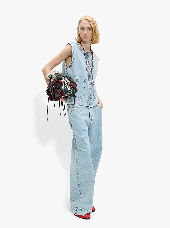%100 pamuktan üretilmiş geniş paça kot pantolon. Ön ve arka cepler. Kemer halkaları. Düğme ve fermuarlı yırtmaç. Model 1,78 m boyunda ve 38 beden giyiyor.