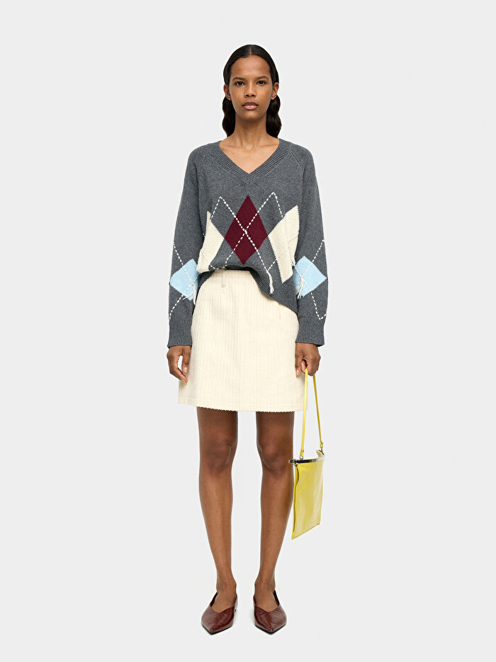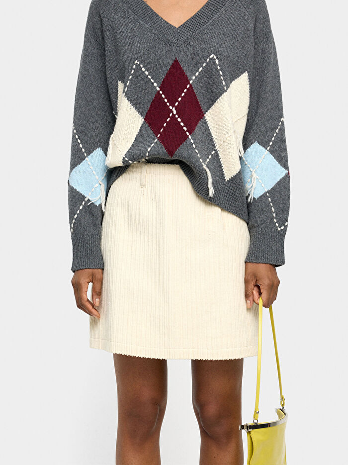 Kısa kadife etek %100 pamuk. Gizli fermuar kapatma. Kemer halkaları. Model 1.76 m boyunda ve S beden giyiyor.