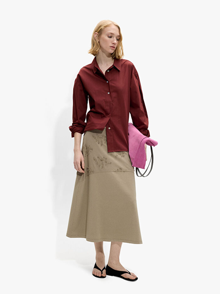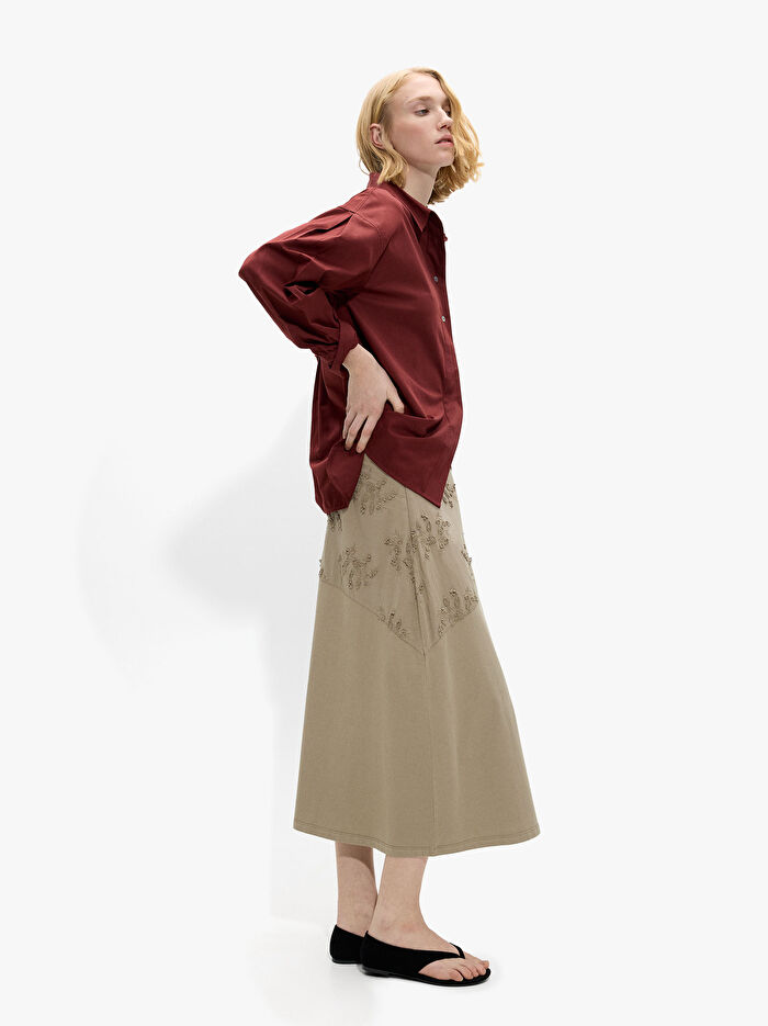 %100 pamuktan üretilmiş midi etek. Üst kısmında nakış detayları bulunur. Geniş kesim. Yanlarda gizli fermuar. Model 1,78 m boyunda ve S beden giyiyor