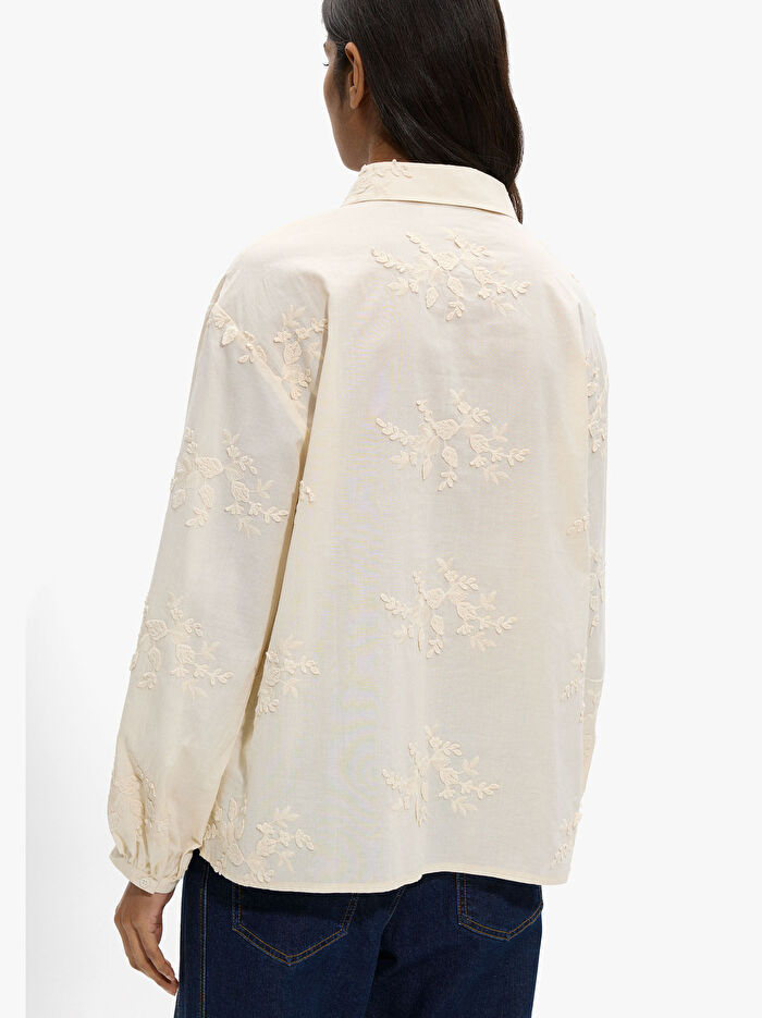 %100 pamuktan üretilmiş, nakışlı gömlek. Uzun kollu, manşetlerinde düğmeli. Model 1,78 m boyunda ve M beden giyiyor.