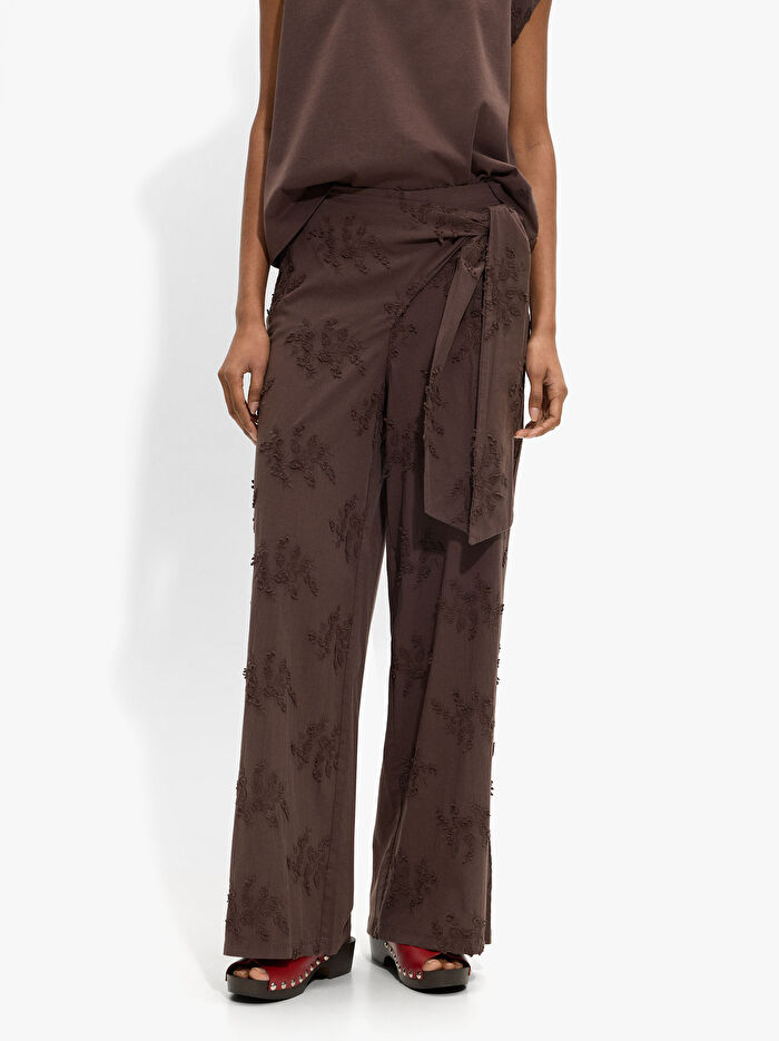 Hafif geniş kesimli pantolon. %100 pamuktan üretilmiştir. Elastik bel. Ön kısmın tamamında nakış detayları. Bir tarafta bağcıkla tutturulan üst üste binen kesim. Model 1,78 m boyunda ve XS-S beden giyiyor.