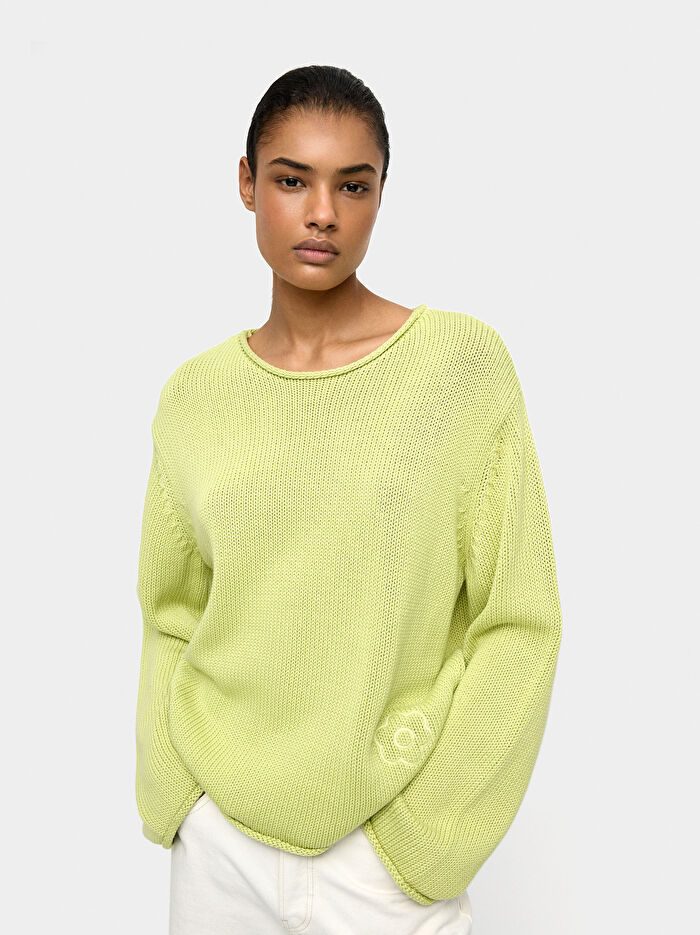 %100 pamuktan üretilmiş örme kazak. Yuvarlak yaka. Uzun kollu. Ön kısmın alt tarafında nakışlı çiçek detayı. Kıvrımlı kenarlar. Model 1,80 m boyunda ve XS-S beden giyiyor.