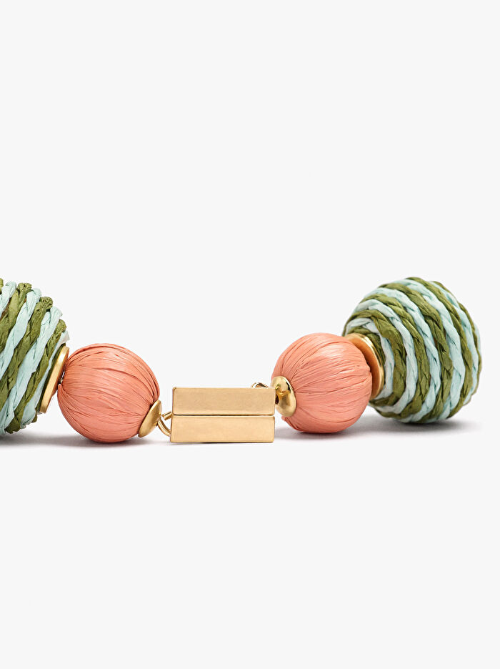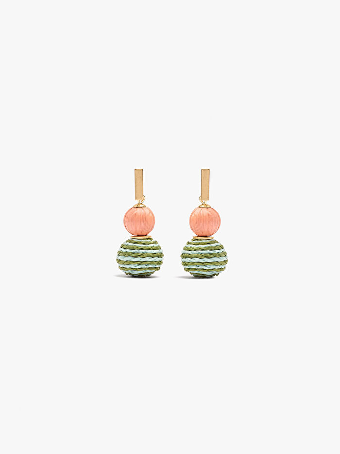 Ahşap boncuklu çubuk şeklinde tabanlı ve rafya efektiyle örülmüş uzun küpe. Kontrast renkler. Eskitme efekti.