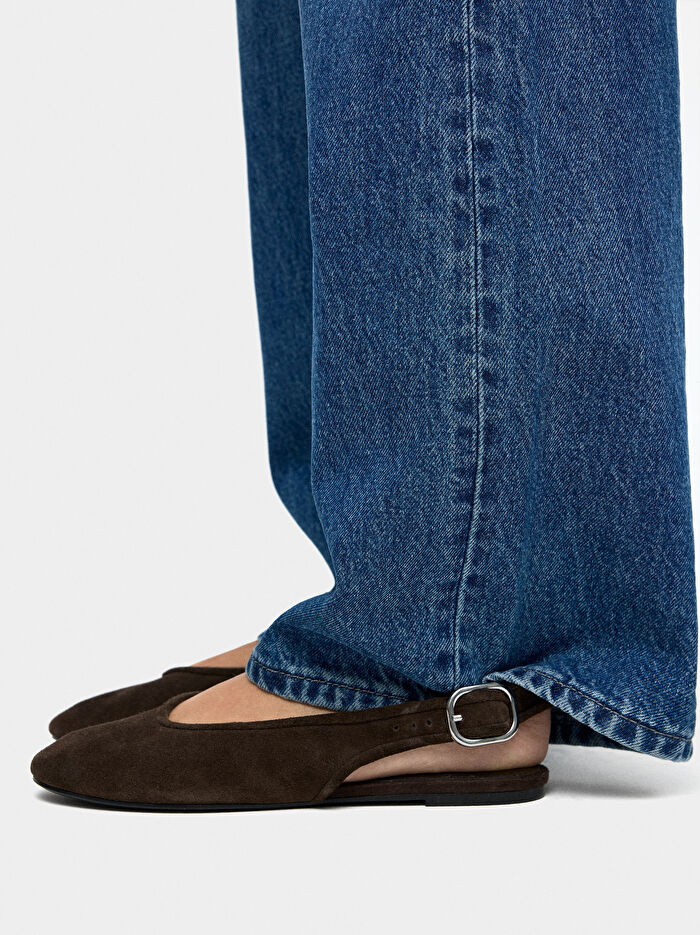 Arkası bantlı deri babet. Daha fazla konfor için yastıklı, belirgin dikişli iç taban. Yuvarlak burun. Bilekte ayarlama tokalı. Termoplastik poliüretan taban.
