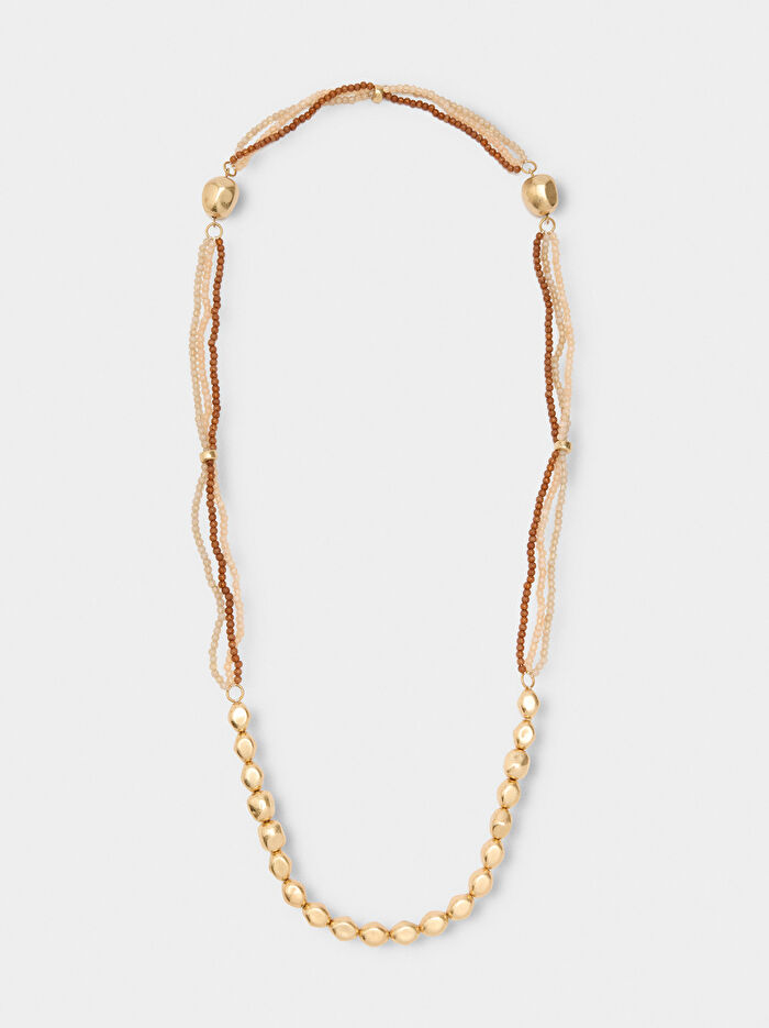 Uzun asimetrik kolye. Taş efektli küçük çoklu resin boncuklar ve altın rengi daha büyük boncuklar içeren segmentler. Eskitilmiş efekt.