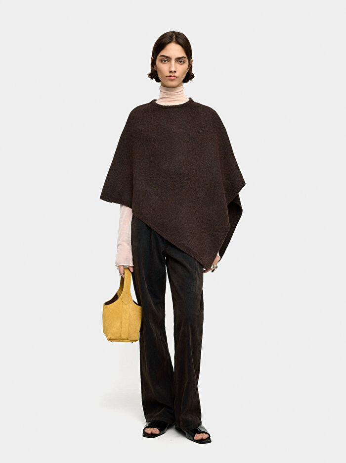 Asimetrik etekli, pürüzsüz örgü panço. Yuvarlak yaka. Nervürlü kenarlar. Tek beden olarak sunulan bu ürün, çeşitli silüetler yaratmak ve farklı vücut tiplerine uyum sağlamak için tasarlanmıştır. Model 1,77 m boyundadır.