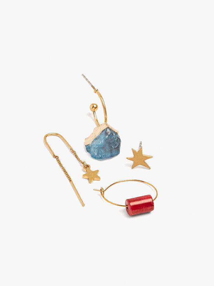 Dört çift küpe seti: iki çift taş aksesuarlı halka küpe; iki çift yıldız şeklinde kısa küpe.