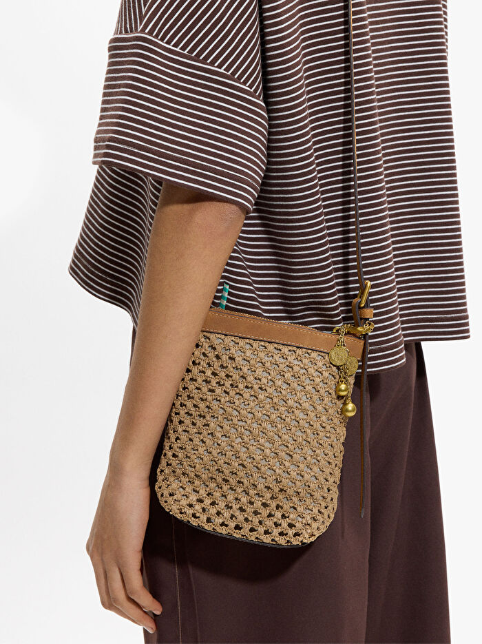 Hasır efektli telefon çantası. İç astar.charm detaylı fermuarlı kapatma. Sabit ve ayarlanabilir çapraz askılı çanta askısı.