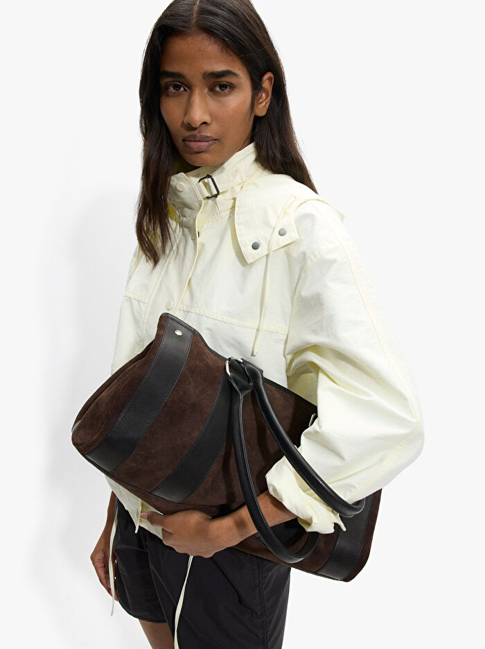 Orta boy deri shopper çanta. Dikdörtgen şekilli, dış kısmında kayış detayları. İç cepli. Fermuarlı. Sabit omuz askıları. Ayarlanabilir ve çıkarılabilir çapraz askı kayışı dahildir.