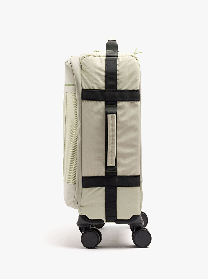 Yanlarında file detayları bulunan, teknik kumaştan üretilmiş sade bir seyahat valizi. Dört tekerlekli. Güvenli kilit mekanizmalı, ergonomik ve uzatılabilir sap. Fermuarlı ve file iç cepler. İç kısımda elastik bantlar. Üst ve yan tutma sapları. Fermuarlı ön cep. Karabina kancalı, çıkarılabilir askı.