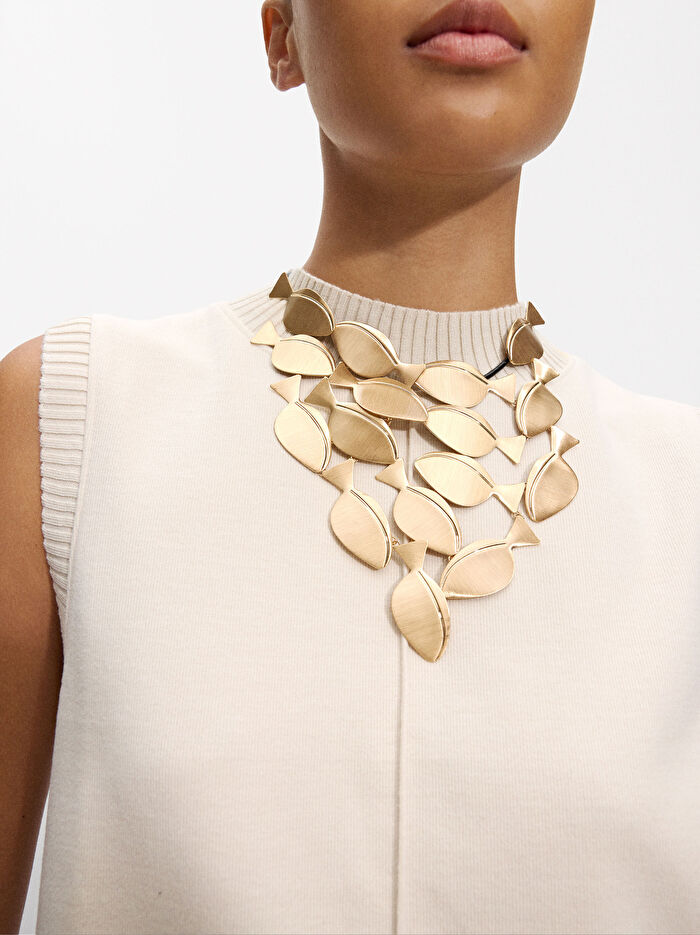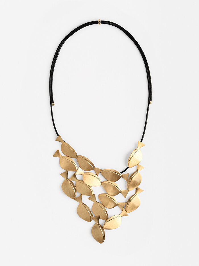 İç içe geçmiş balık şekilli , mat efektli, deriden ayarlanabilir ip kolye. Gold kaplama.