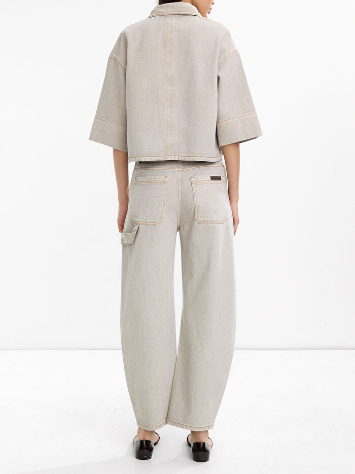 Bol pamuklu denim pantolon. %100 pamuktan üretilmiştir. Ön kısımda üç cepli. Arka kısımda iki cep. Düğme ve fermuar kapamalı yırtmaçlı. Model 1.80 m boyundadır ve 34 beden giymektedir.