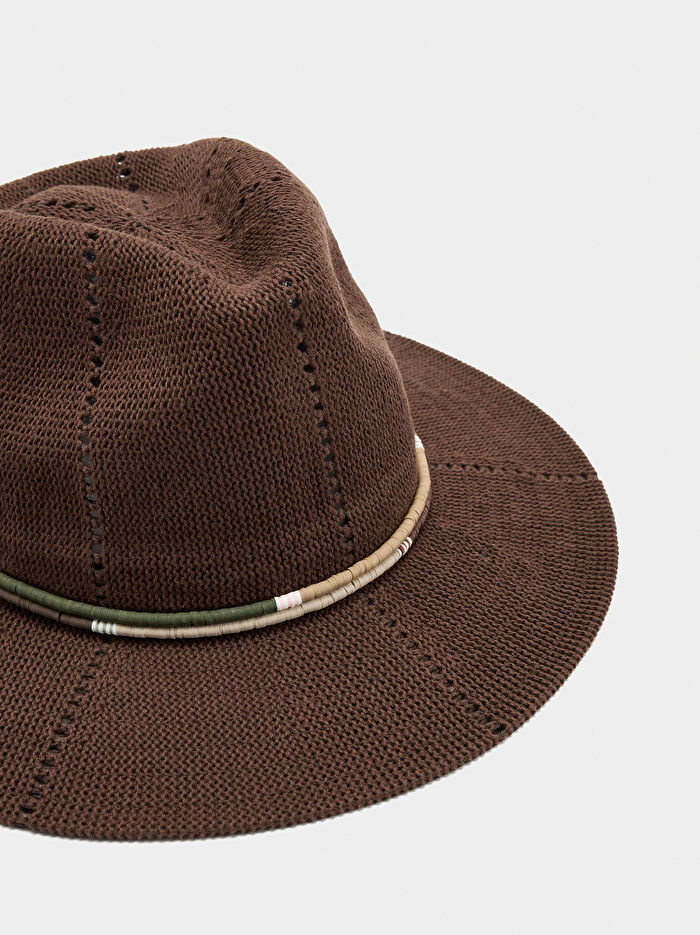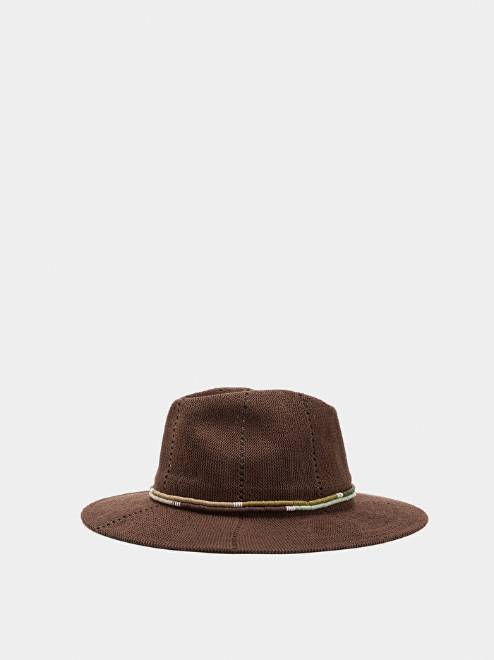 Delikli yapılı örgü şapka. Ayar için iç bant. Çeşitli renklerde düz boncuklu kordon detayları.