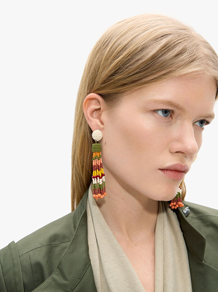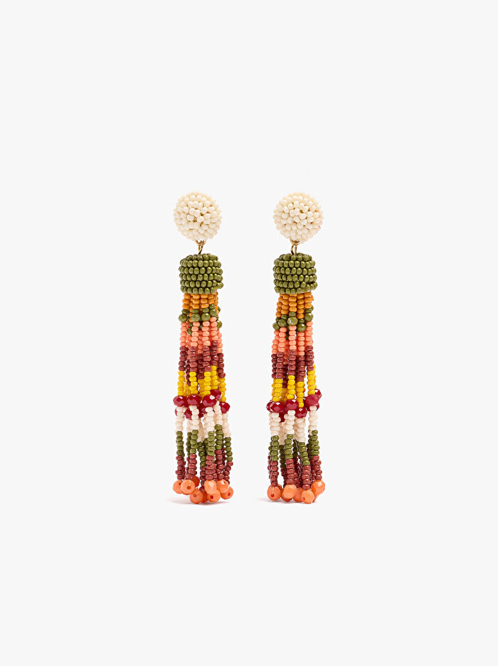 Çok renkli cam boncuklu uzun küpeler. Yuvarlak taban. Parlak bitiş.