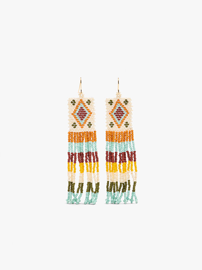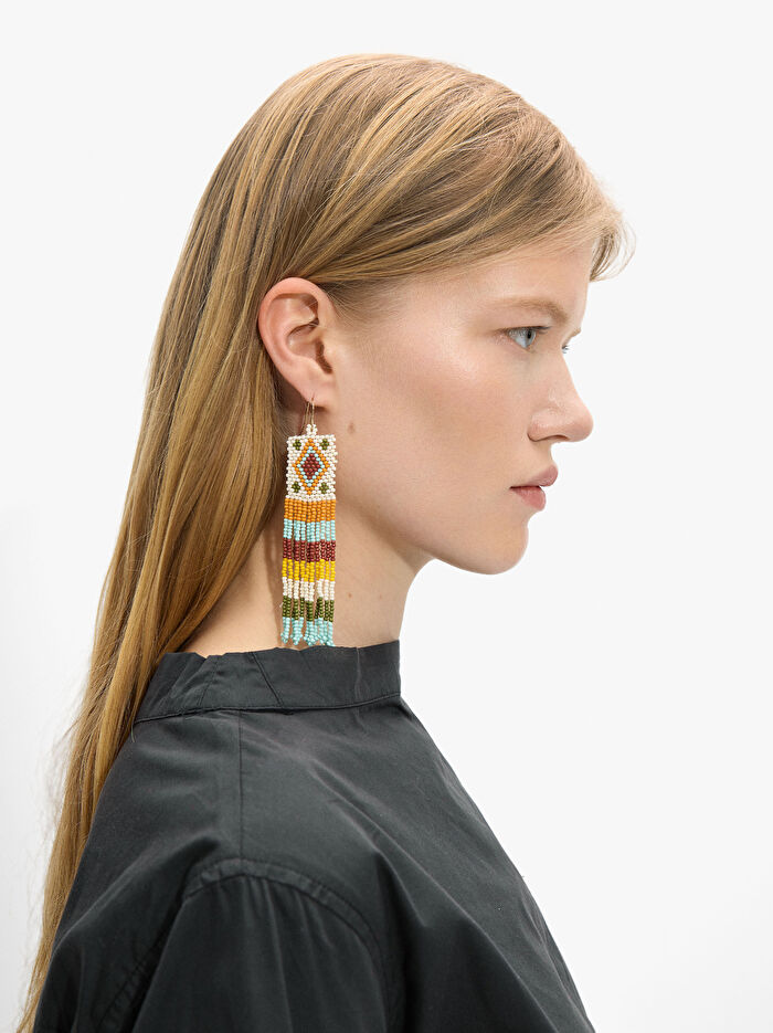 Çok renkli boncuklu ve baklava desenli kare tabanlı uzun küpe. Parlak bitiş.