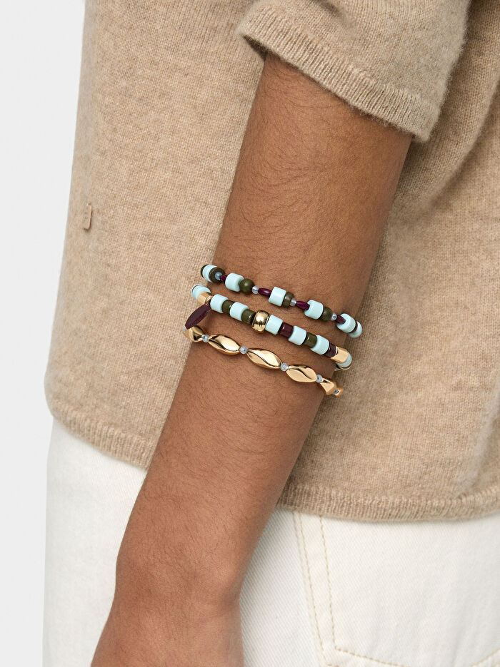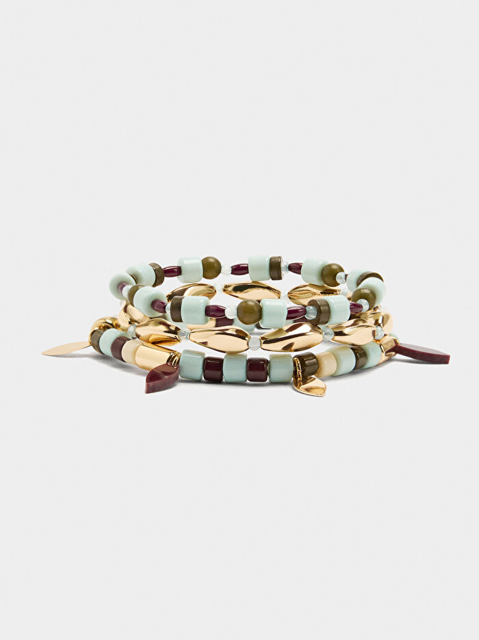 Çeşitli şekil, boyut ve renklerde resin boncuklu üç elastik bileklik seti.