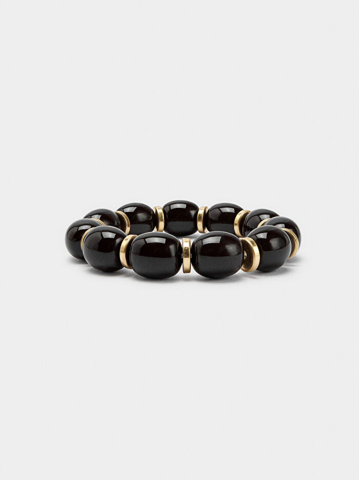 Oval boncuklardan ve aralarına yerleştirilmiş düz boncuklardan oluşan elastik bileklik. Eskitilmiş efekt.