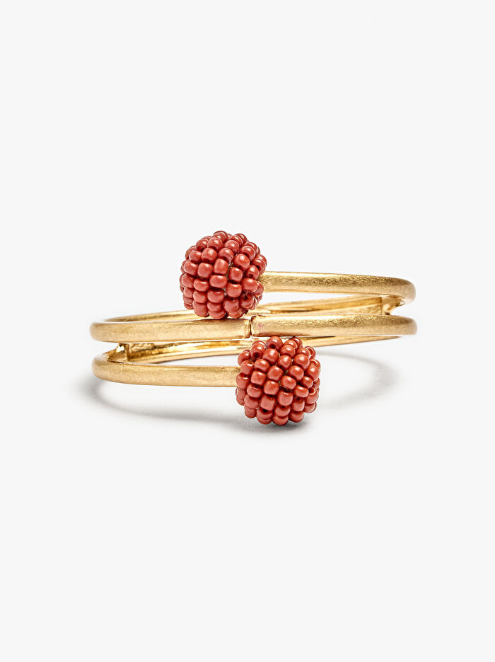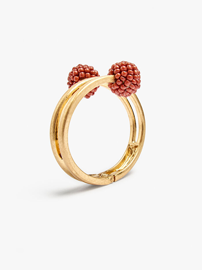 Menteşeli, spiral efektli sert bilezik. Uçlarında tamamen boncuklarla kaplanmış boncuk detayı. Eskitme efekti.