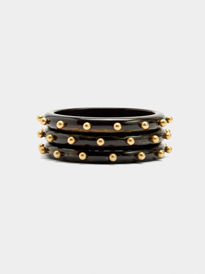 Tüp şeklinde üç adet sert reçine bilezik seti. Küre detayları. Eskitilmiş efekt.