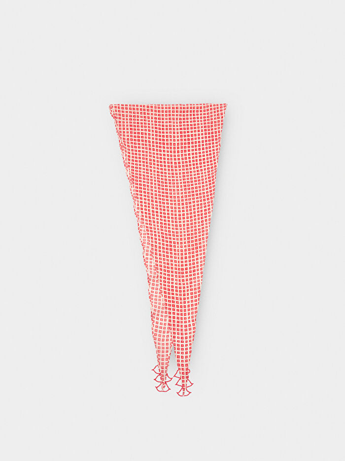 Kare desenli üçgen eşarp. Uçlarında boncuk detayı. Görünümleri sofistike bir dokunuşla vurgulamak için ideal.