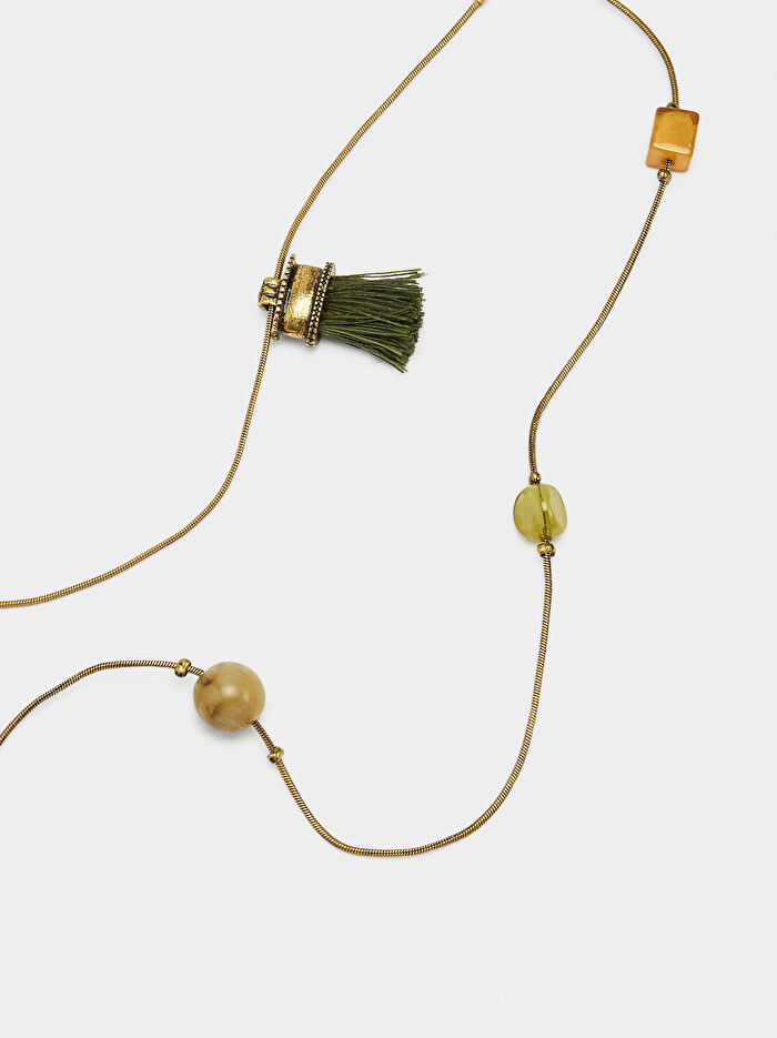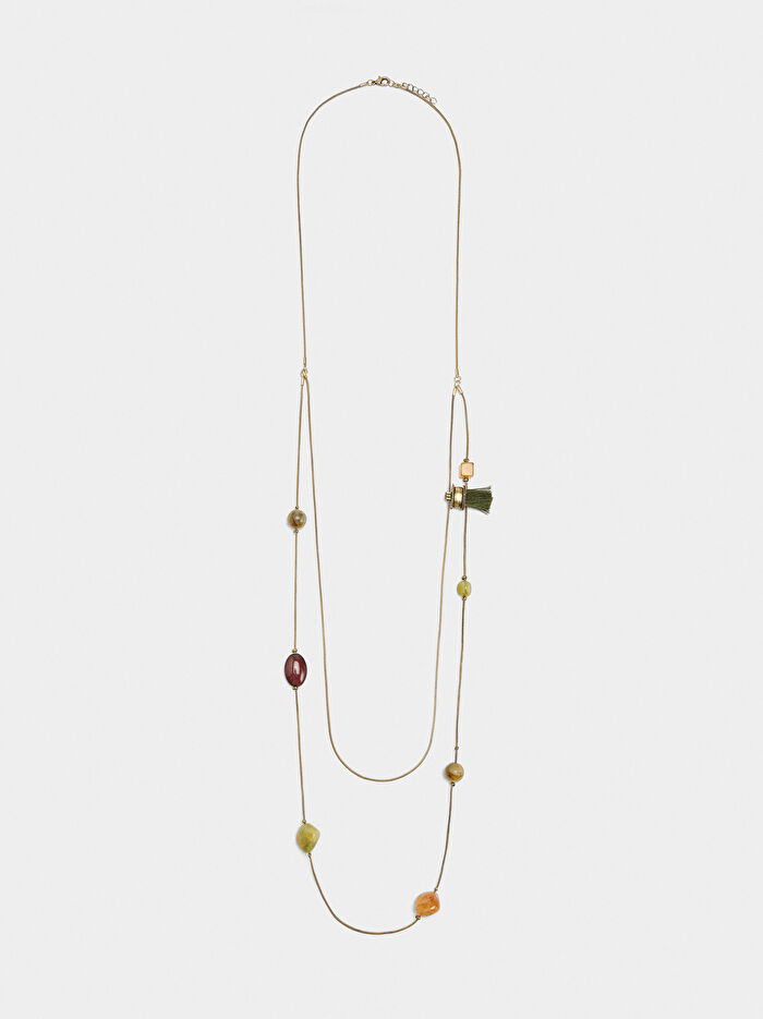 Yılan zincirli uzun kolye. Çift efektli. Püskül detayı ve farklı boyutlarda, şekillerde ve renklerde, taş efektli boncuklar. Istakoz kilitli kapama.