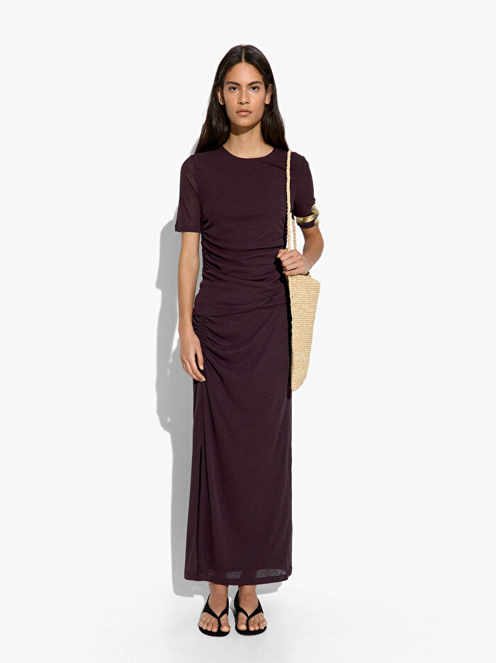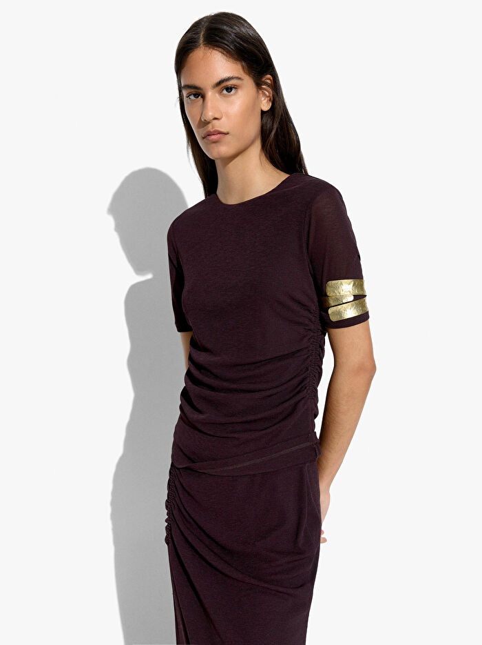 Yanları büzgülü sade bluz. Yuvarlak yaka. Kısa kollu. Model 1.75 m boyunda ve XS-S beden giymektedir.