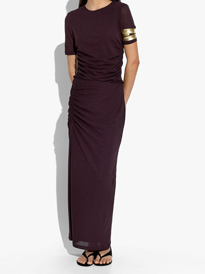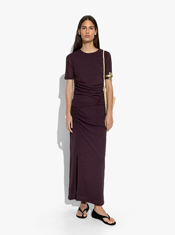 Tek taraflı büzgülü uzun düz etek. Alt yan yırtmaç. Elastik bel. Model 1.75 m boyunda ve XS-S beden giymektedir.