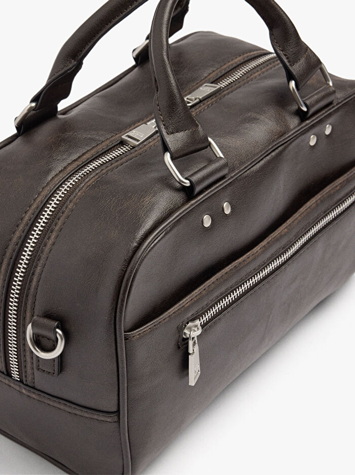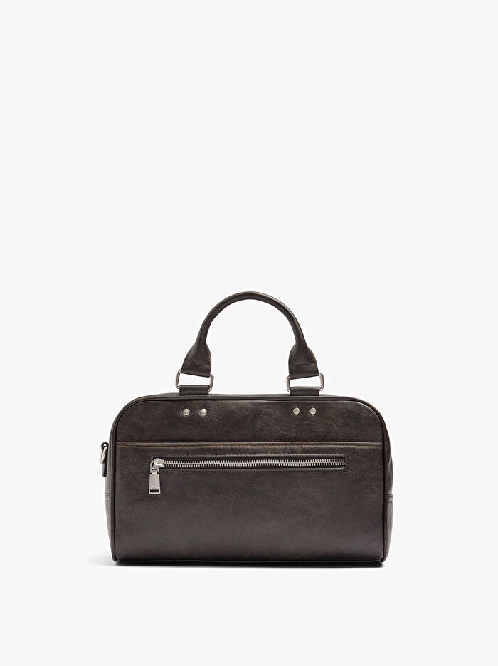 Çatlak efektli, yapılı orta boy tote çanta. Dikdörtgen şekil. Astar ve iç cep. Dış cepler. Fermuarlı kapatma. Sabit el askıları. Ayarlanabilir ve çıkarılabilir çapraz askılı çanta askısı içerir.