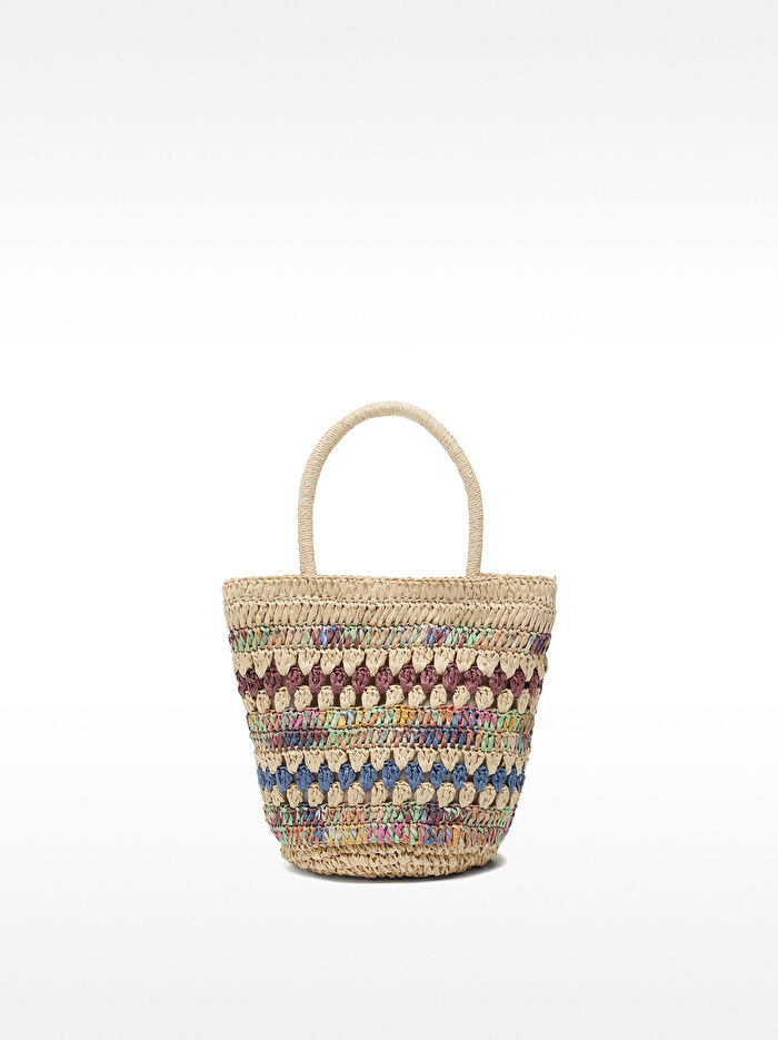 Çok renkli örgülü hasır efektli el çantası. Astarlı ve iç cepli. Sabit el askıları. Ayarlanabilir ve çıkarılabilir çapraz çanta askısı içerir.