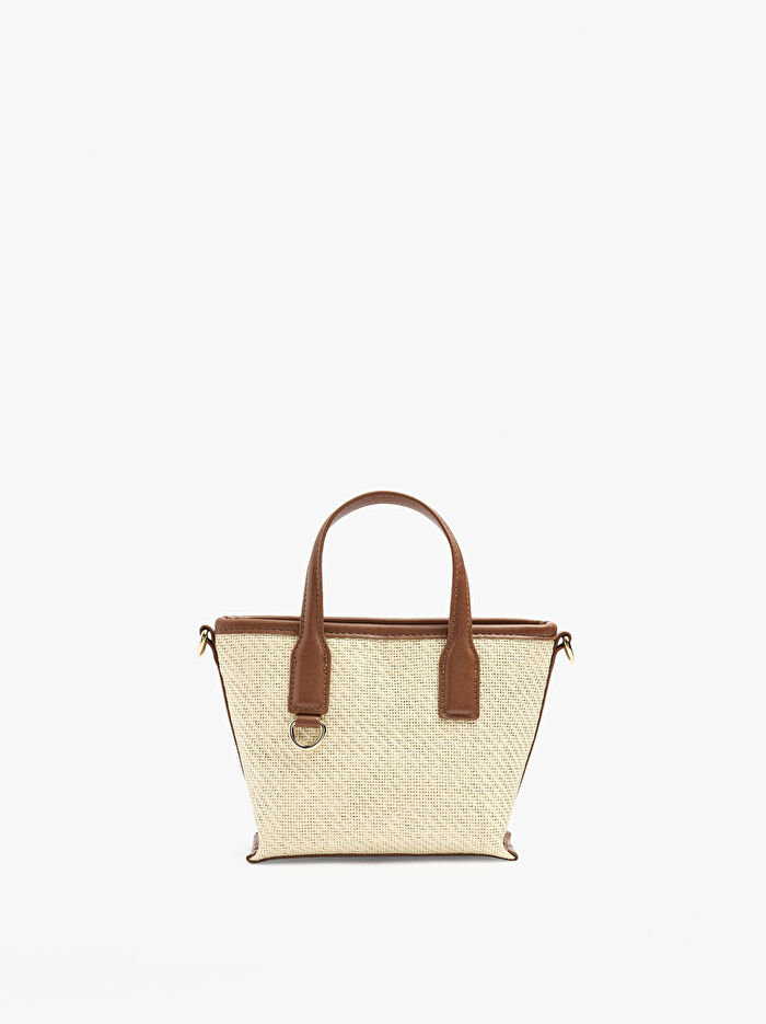 Hasır görünümlü tote çanta. Küçük boy. Astarlı ve iç cepli. Fermuarlı. Sabit tutma sapları. Ayarlanabilir ve çıkarılabilir çapraz askı kayışı dahildir.