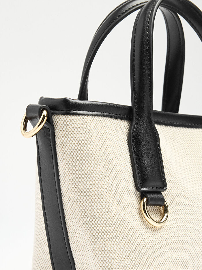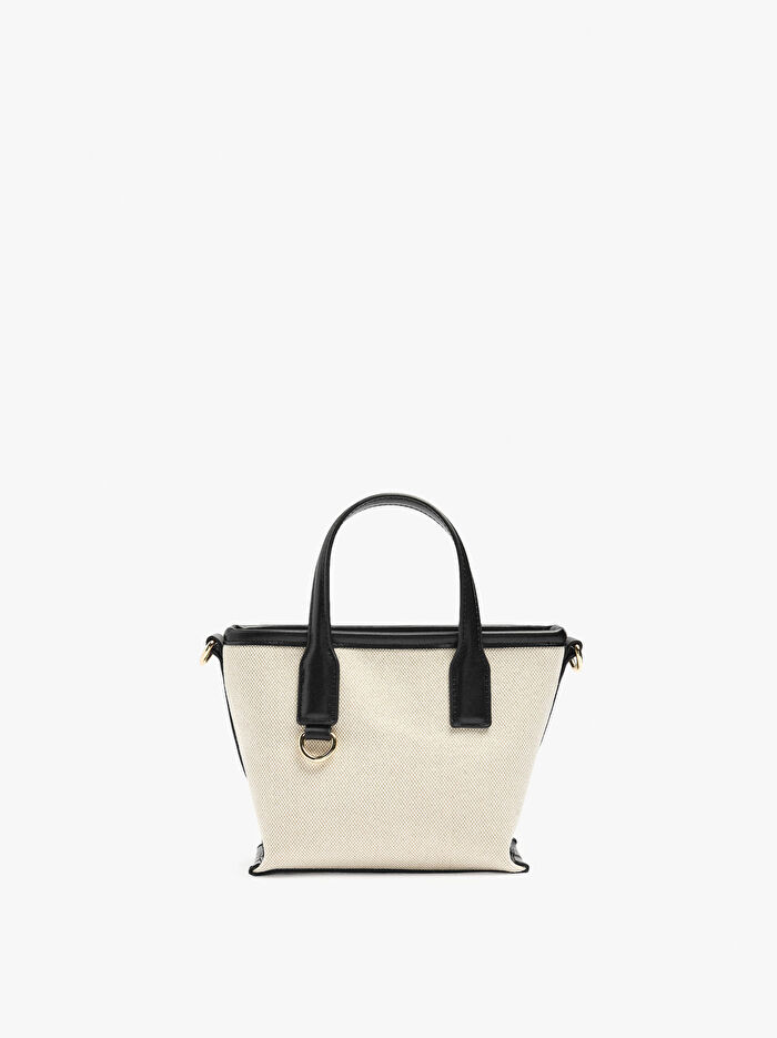 Hasır görünümlü tote çanta. Küçük boy. Astarlı ve iç cepli. Fermuarlı. Sabit tutma sapları. Ayarlanabilir ve çıkarılabilir çapraz askı kayışı dahildir.
