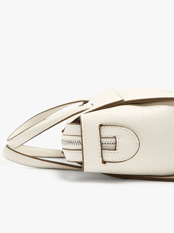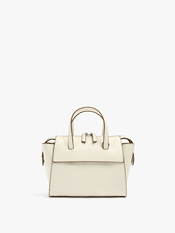 Küçük ve yapılı tote çanta. Deri efektli. Astar ve iç cep. Kontrast dokular. Fermuarlı kapatma. Sabit el askıları. Ayarlanabilir ve çıkarılabilir çapraz askılı çanta askısı içerir.