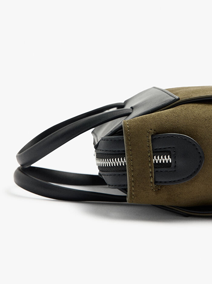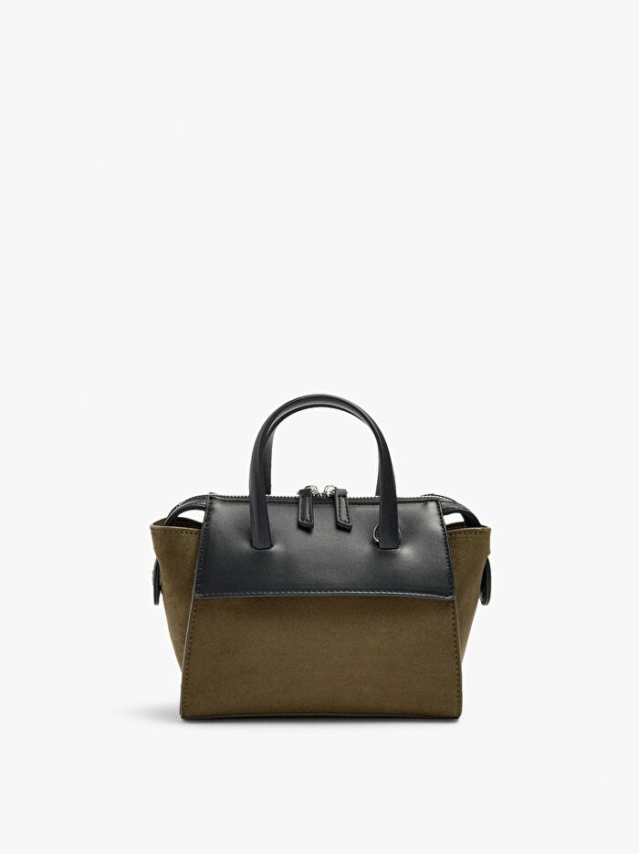 Küçük ve yapılı tote çanta. Deri efektli. Astar ve iç cep. Kontrast dokular. Fermuarlı kapatma. Sabit el askıları. Ayarlanabilir ve çıkarılabilir çapraz askılı çanta askısı içerir.