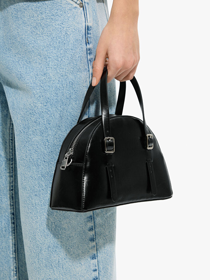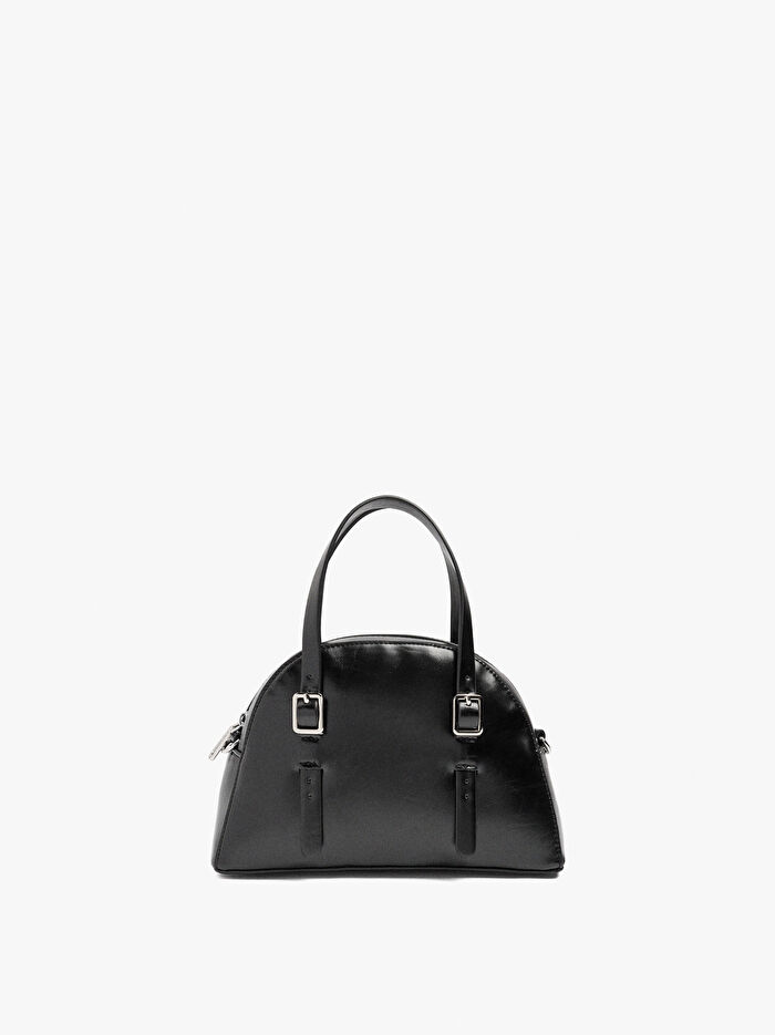 Yuvarlak şekilli küçük sade tote çanta. İç astar. Tokalı sabit ve ayarlanabilir el askıları. Ayarlanabilir ve çıkarılabilir çapraz askı.