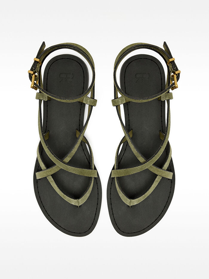 Ayak üstünde ve bilekte çapraz kayışlı, bağlama ve ayarlama için tokalı deri sandalet. Ayak desteği. Dikişli iç taban. Oval ayak ucu. Kauçuk taban.