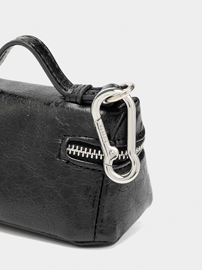 Çatlak efektli bozuk para cüzdanı. İç astar. Fermuarlı kapama. Sabit kayış. Anahtarlık tokası detayı.