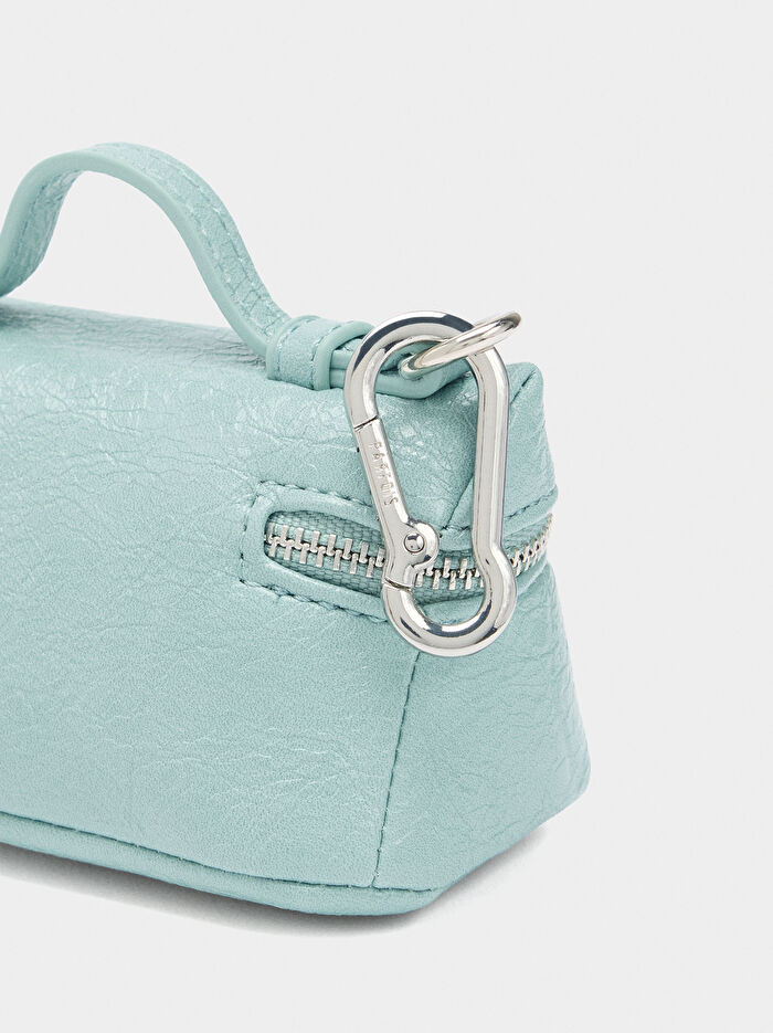 Çatlak efektli bozuk para cüzdanı. İç astar. Fermuarlı kapama. Sabit kayış. Anahtarlar için karides kancası detayı.