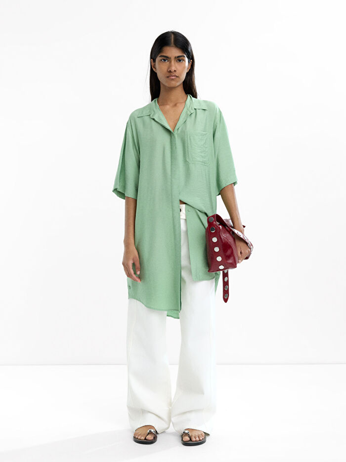Yan cepli kısa gömlek elbise. Yakalı. Kısa kollu. Gizli düğmeli. Düğmeli yan yırtmaçlar. Model 1,72 m boyunda ve S beden giyiyor.